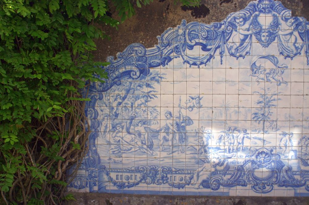 Descrição: Composição novecentista, ao estilo do século XVIII, representando duas cenas da mitologia clássica: o mito de Adónis e Vénus, sobre o lado esquerdo e a lenda de Dionísio e Ariadne, sobre o lado direito. A figuração principal, além das duas cenas mencionadas, contempla figuras aladas e putti em acções de entretenimento, tudo enquadrado numa moldura teatral, de cariz barroco. Esta é composta por elementos neoclássicos e estilizados, dos quais fazem parte duas cartelas, uma a fechar o topo superior e outra na base, ambas ladeadas por um par de putti, e ainda por um par de colunas simuladas que integram um atlante cada, segurando os capiteis e, consequentemente, toda a moldura superior.