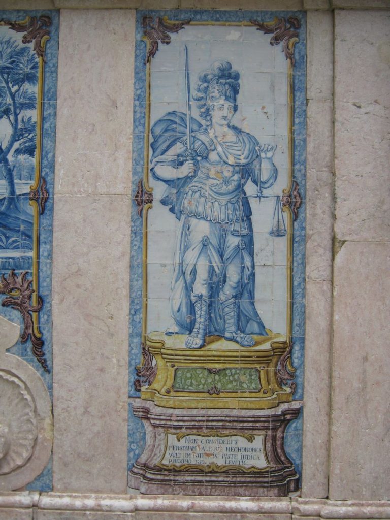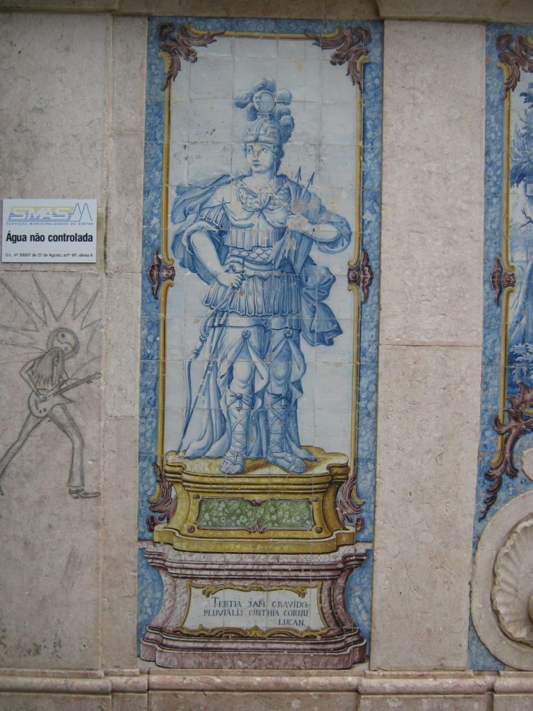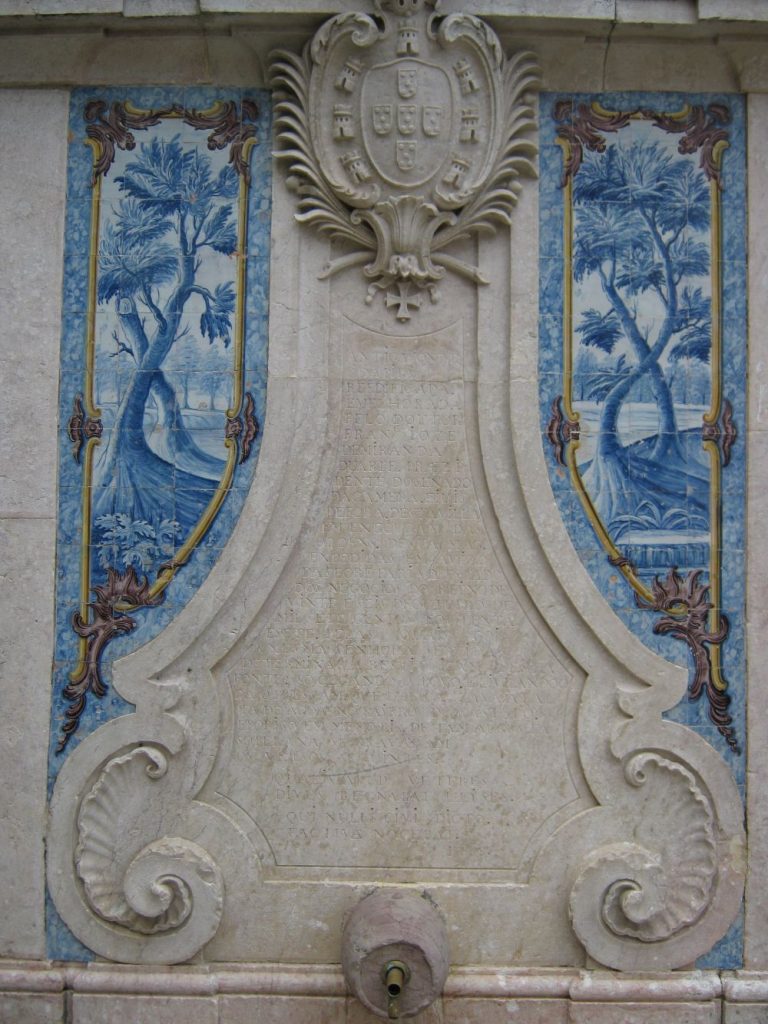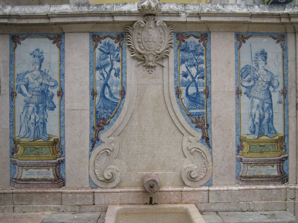 Descrição: Revestimento parietal da Fonte da Pipa, datado de 1788. O conjunto divide-se em três secções: o painel central representa fragmentos de paisagem natural e envolve o frontispício da fonte em pedra de lioz, que ostenta as armas portuguesas, uma pequena pipa de onde jorra a água e uma lápide gravada que relata a história da reconstrução da fonte, ordenada no ano anterior pela rainha Dona Maria I; dois painéis laterais com a representação de Diana, do lado esquerdo, e da Justiça, do lado direito. A inscrição da lápide homenageia a rainha agradecendo-lhe a intervenção naquela antiga fonte, bem como a restituição da água ao povo que estava a ser desviada, supostamente, para uma propriedade do Marquês de Pombal.