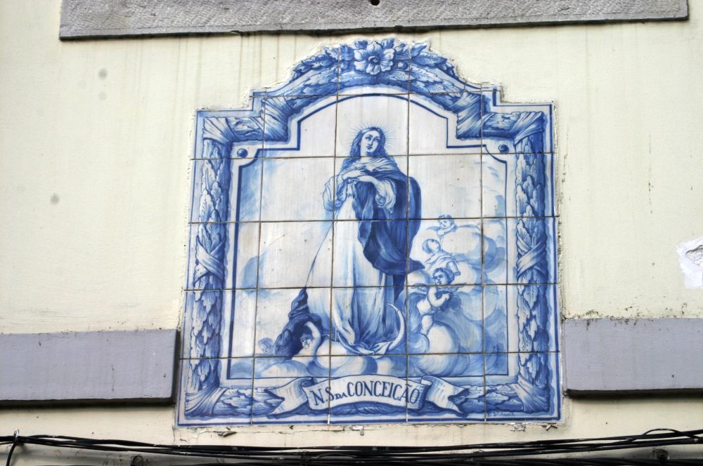 Descrição: Registo alusivo a Nossa Senhora da Conceição, em tons de azul, de autoria da Fábrica Sant’Anna.