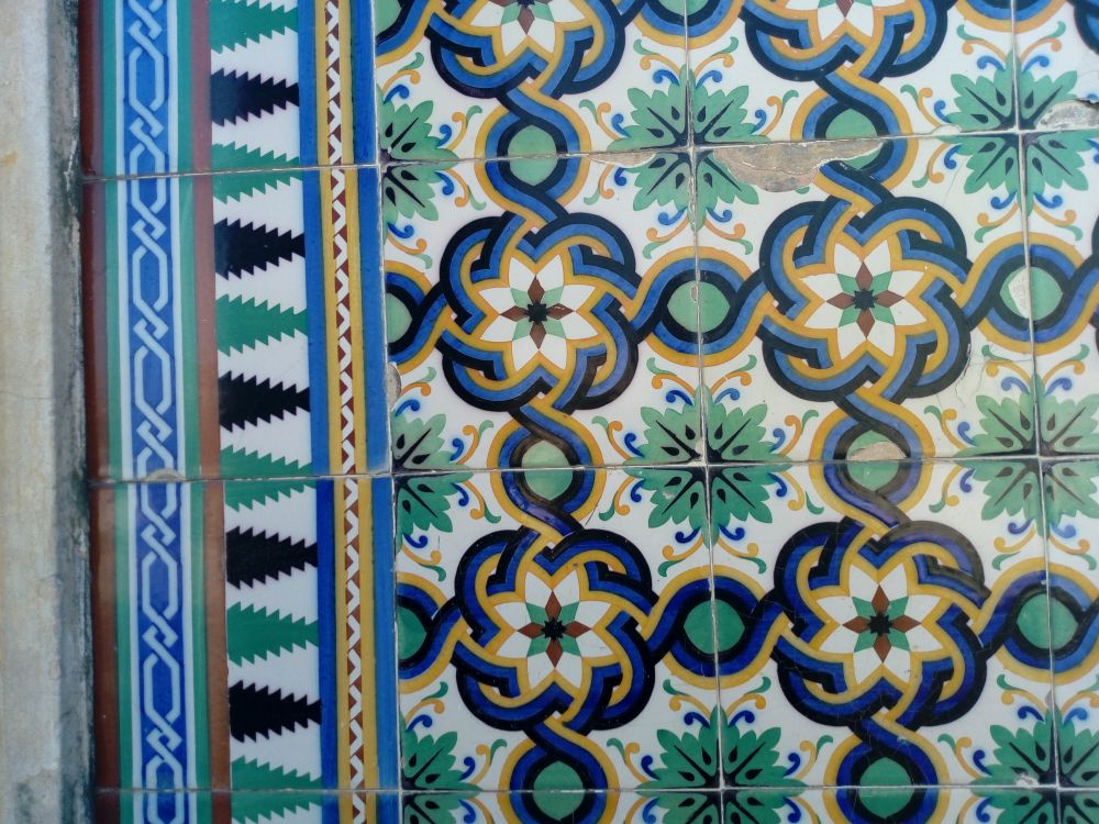 Descrição: Padrão policromo de elemento único influenciado pela azulejaria hispano-mourisca produzida no século XVI em Sevilha. O revestimento da fachada do imóvel de dois pisos é total. Está ainda presente uma cercadura que acompanha a cantaria no comprimento e largura da fachada, a qual apresenta como motivos principais ameias sírias repetindo-se continuamente embora em duas cores – preto e verde – que alternam entre si. Padrão similar existente nos catálogos da Fábrica Viúva Lamego, com a designação «Moçárabe». Motivos concebidos por meio de estampagem.