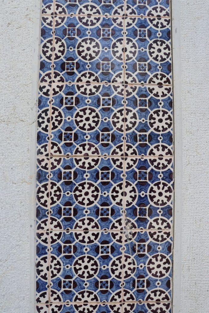 Descrição: Padrão de elemento único, policromo, que concilia a técnica da estampilha com a pintura manual livre. Os motivos, embora de inspiração vegetalistas, resultam numa composição geométrica na qual sobressaem círculos que se ligam entre si, na horizontal e na vertical, através de hastes que se cruzam na forma de quadrados. No interior das figuras geométricas, bem como nos lados dos quadrados, inscrevem-se os motivos de cariz vegetalista. Cromia em dois tons de azul, um dos quais muito escuro, preenchendo quase totalmente o fundo branco do azulejo, que é aproveitado para contornos. Padrão constante nos catálogos da Fábrica das Devezas.