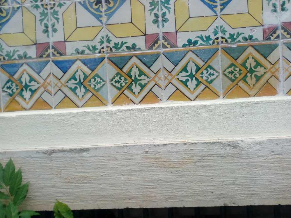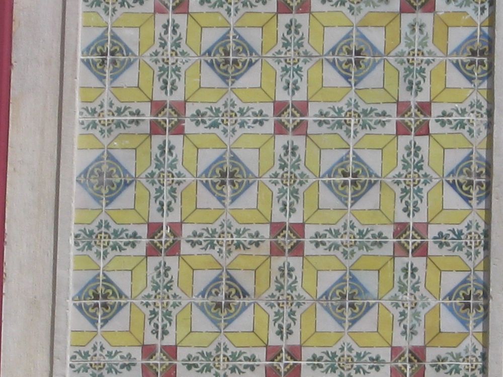 Descrição: Padrão de estilo 2×2 policromo estampilhado, de cariz geométrico, com apontamentos vegetalistas. Aliada à padronagem, está presente uma cercadura que apenas delimita os elementos de cantaria exteriores (paredes mestras, rodapé e arquitraves). Uma vez mais, combinam-se elementos geométricos com vegetalistas. A proveniência bem como a datação de toda a cerâmica é desconhecida, embora se possa enquadrar na produção lisboeta de finais do século XIX.