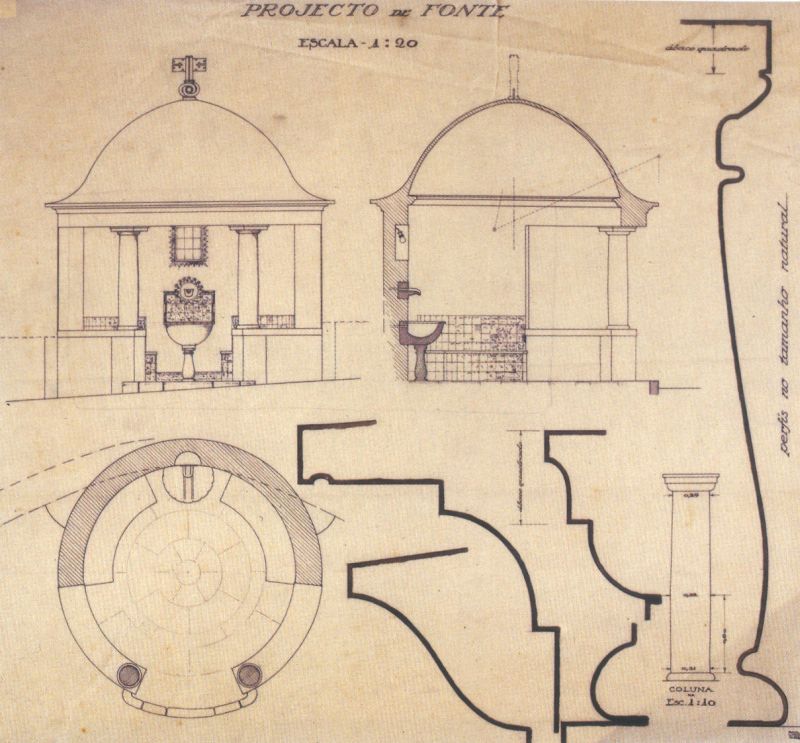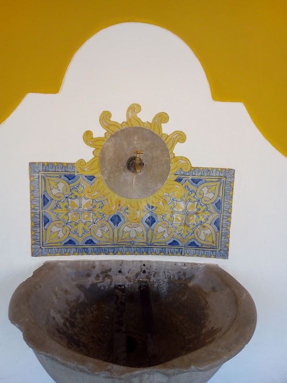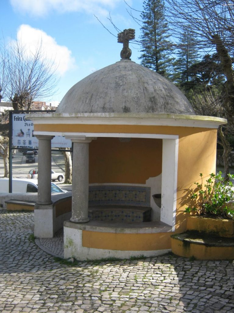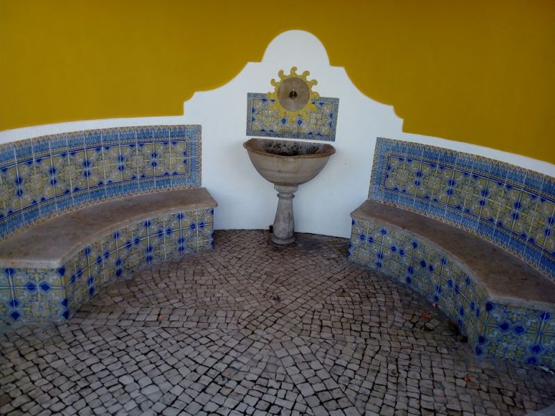 Descrição: Revestimento parcial do espaço interior de chafariz público, de autoria do arquitecto Raul Lino. Peça arquitectónica criada entre os anos de 1928 e 1929. Composição decorativa inspirada na padronagem típica do século XVII concebida em tons de azul e amarelo. Integra motivos vegetalistas e um par de chaves que se cruzam, atributos do santo que dá o nome à localidade e que encimam o topo da cúpula do Chafariz.