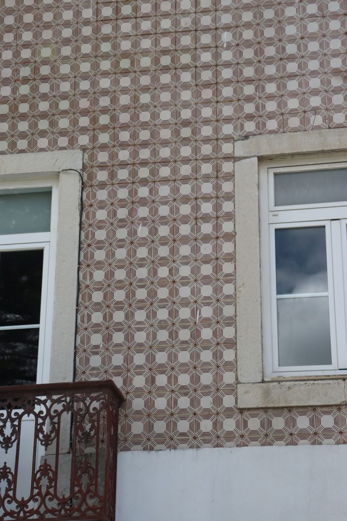 Descrição: Padrão geométrico de elemento único, estampado, castanho sobre fundo branco. A partir de um octógono desenhado no centro da peça, são projectadas quatro filas de linhas, paralelas aos seus lados, em direcção aos limites do azulejo. Tal proporciona um movimento estático na leitura horizontal e vertical, e dinâmico nas diagonais, uma vez que são formadas «cruzes» na junção dos azulejos. Revestimento total do piso superior do edifício, que conta ainda com uma barra de arquitrave de elementos vegetalistas e florais policromos, de estilo «Arte Nova».