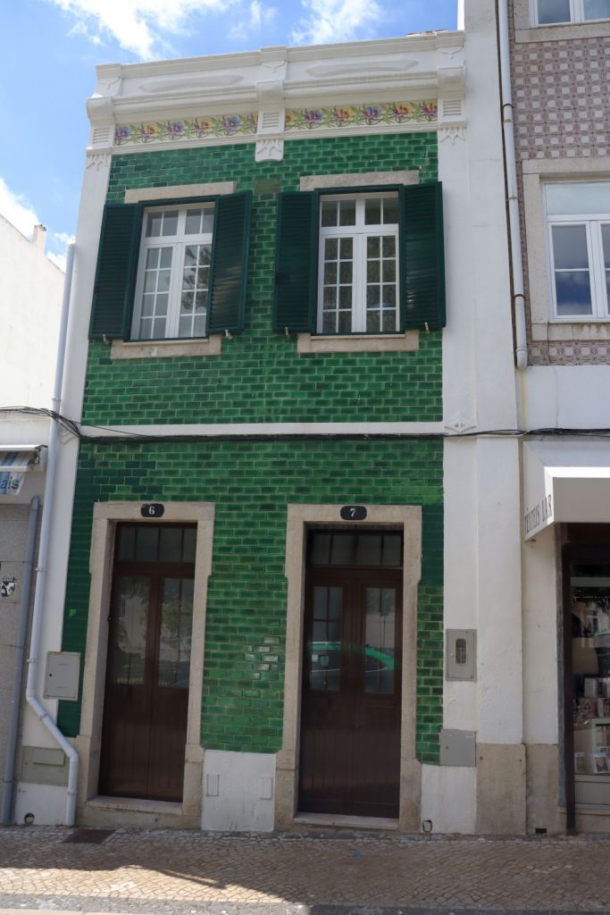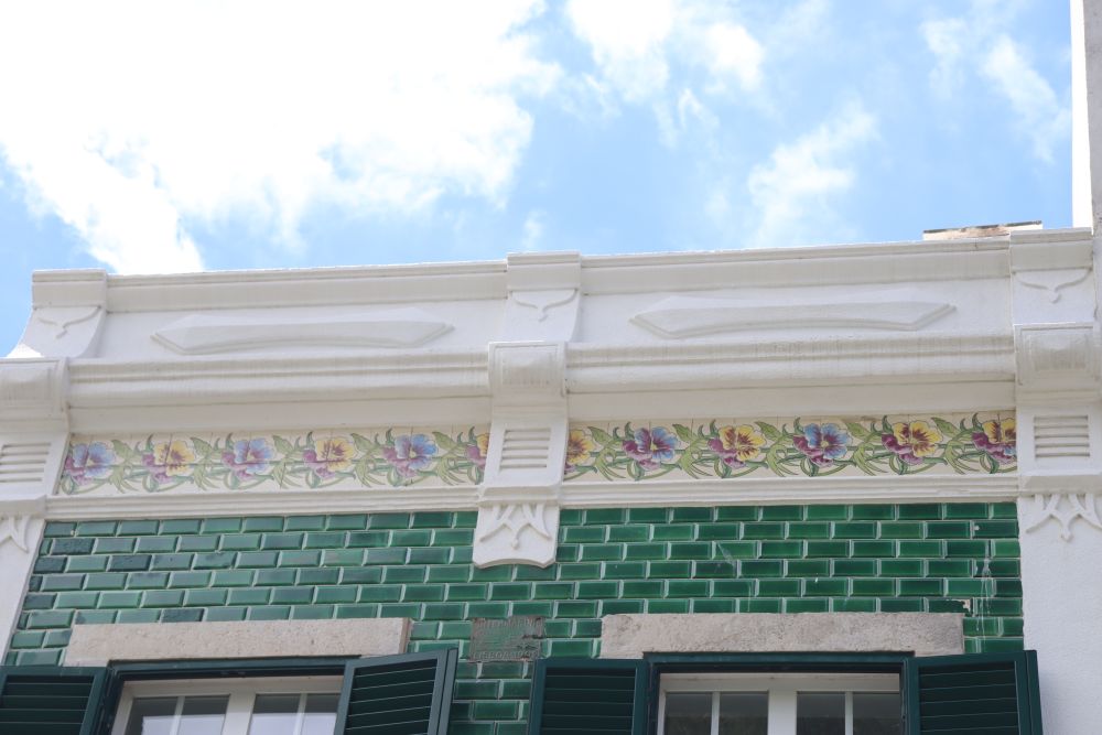 Descrição: Padrão de elemento único, relevado de cor verde. Esta tipologia difere do azulejo habitual pelo facto de as peças corresponderem à dimensão de metade de um quadrado, rectangulares portanto. Constituída numa só cor e inscrevendo figuras rectangulares em relevo através da utilização de um bisel, visa simular um revestimento pétreo. Edifício totalmente revestido acima do embasamento, apresentando ainda uma barra de arquitrave «Arte Nova» com motivos florais (amores-perfeitos) policromos. Modelos bem conhecidos da Fábrica de Sacavém. A presença de uma chapa metálica afixada da Companhia de Seguros Ultramarina, com a data de 1901, permite localizar a antiguidade do edifício e respectivo revestimento azulejar.