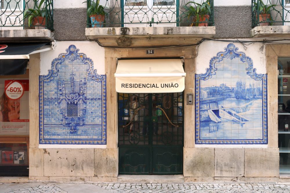 Descrição: Conjunto de dois painéis figurativos em tons de azul e branco que decoram a entrada da Residencial União. De autoria de Francisco Pereira e produzidos na fábrica E.L.A. de Aveiro, representam um a icónica janela do Convento de Cristo e o outro uma paisagem da cidade de Tomar, inspirado num postal antigo.