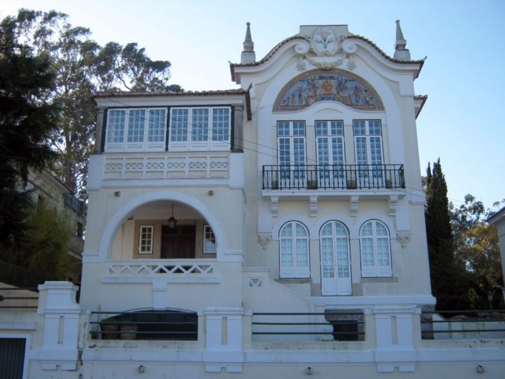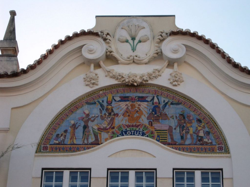 Descrição: Painel envolvendo o frontão da vivenda «Lótus», de autoria do arquitecto Norte Júnior. A representação- policroma – é inspirada no episódio do País dos Lotófagos, ou comedores de Lótus, presente na Odisseia de Homero. Localização: Avenida Adriano Júlio Coelho, n.º 13 – Sintra.