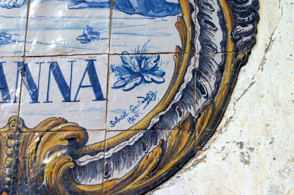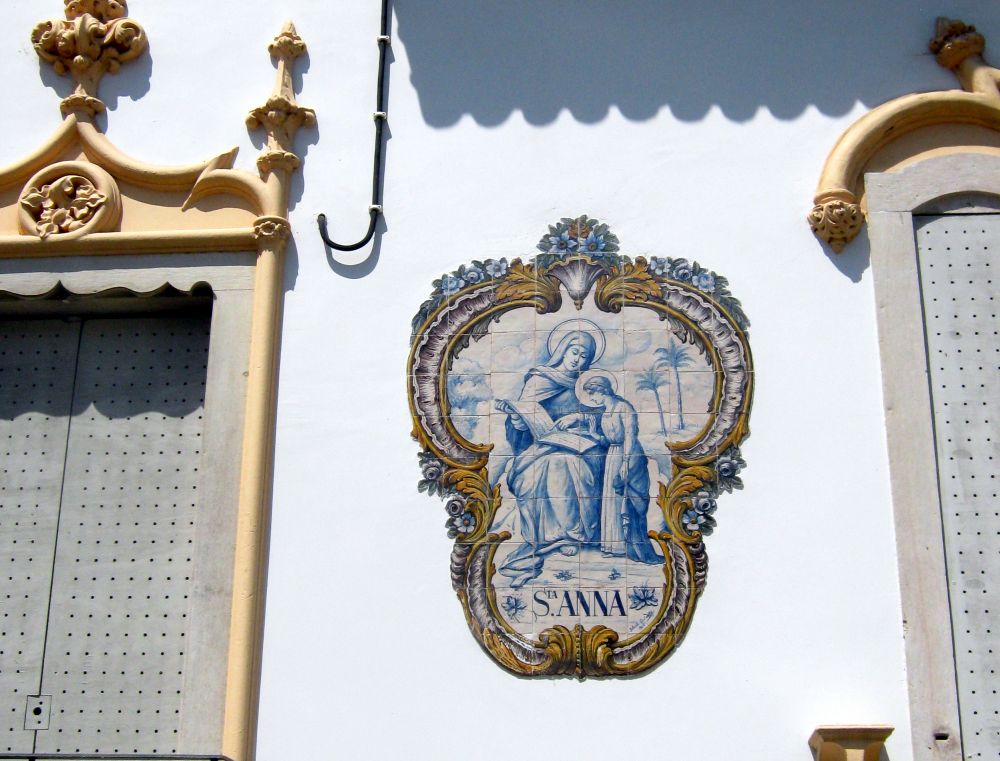 Descrição: Representação de Santa Ana ensinando sua filha – a Virgem Maria – a ler, esse que é o seu principal atributo iconográfico. A figuração é enquadrada numa moldura policroma ao estilo rocaille, em forma de 8, mais larga na parte superior, composta por elementos vegetalistas e estilizados. Autoria de Gabriel Constante e datada de 1924.