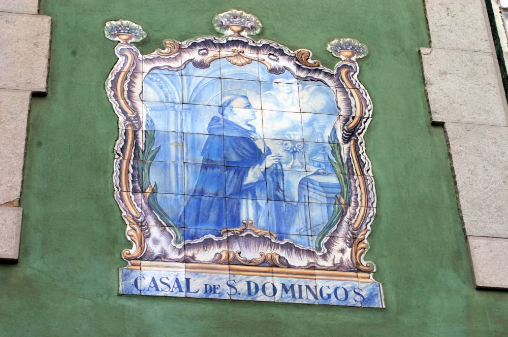 Descrição: Registo de São Domingos de autoria de Gabriel Constante. O santo apresenta-se em posição de contemplação, junto a um pequeno altar, com o terço na mão. Este objecto é o seu principal atributo iconográfico, uma vez que, segundo a lenda, a tradição da reza do Rosário deve-se ao facto de a oração ter sido ensinada ao santo pela Vigem Maria. Da cena, toda em tons de azul, constam ainda um par de anjos que olham na mesma direcção de São Domingos, um castiçal, uma jarra de flores e uma folha de papel com a inscrição «AVE MARIA», objectos todos sobre o altar. O fundo é constituído por um fragmento arquitectónico de estilo românico, composto por um par de colunas que sustentam arcos de abóboda.